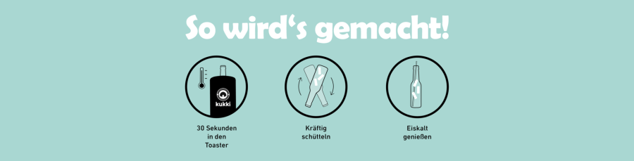 Die frischen Zutaten und die kühlenden Eiswürfel sind bereits in der Flasche enthalten. Nehmen Sie einfach die tiefgefrohrenden Flaschen aus dem Eisschrank und erhitzen Sie diese im Kukki-Toaster. Der Cocktail ist in 30 Sekunden trinkfertig.